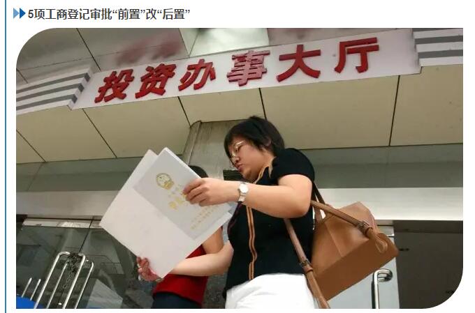 5月,国务院印发《关于进一步削减工商登记前置审批事项的决定》。此次再削减工商登记前置审批事项5项。至此,工商登记前置审批事项87%改为后置审批或取消。